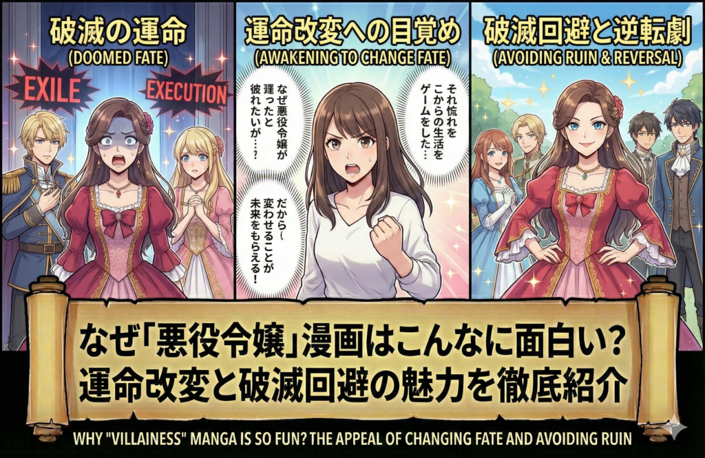 「悪役令嬢」ジャンルとは、乙女ゲームや少女漫画などに登場する“悪役ポジションの令嬢”に転生し、決められた悲惨な未来――通称「破滅フラグ」から逃れるため奮闘する物語のことです。このジャンルは、近年ライトノベルから漫画・アニメへと広く展開され、多くの読者から支持を得ています。