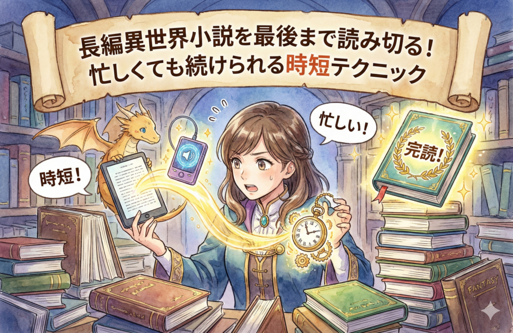 長編の異世界小説を読み切るためには、時間の確保と、読みやすさの工夫が重要です。スキマ時間の活用や読み上げ機能を使った“ながら読書”を取り入れれば、忙しい人でも無理なく物語を楽しむことができます。自分に合った方法を取り入れて、異世界の旅を最後まで満喫しましょう。