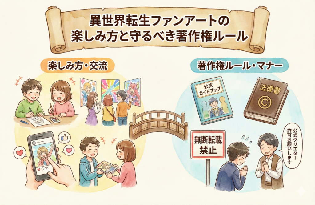異世界転生ジャンルはアニメ化・書籍化される人気作が多く、ファンアート文化も非常に活発です。キャラクターの魅力を自分の手で描く楽しさは格別ですが、一方で「著作権」や「マナー」に配慮しなければトラブルにつながることもあります。本記事では、初心者でも安心してファンアートを楽しむための基礎知識を分かりやすく解説します。
