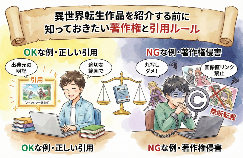 本記事では、初心者でも分かるように、ブログで異世界転生作品を紹介するときの注意点と、著作権の基本を分かりやすく解説します。
